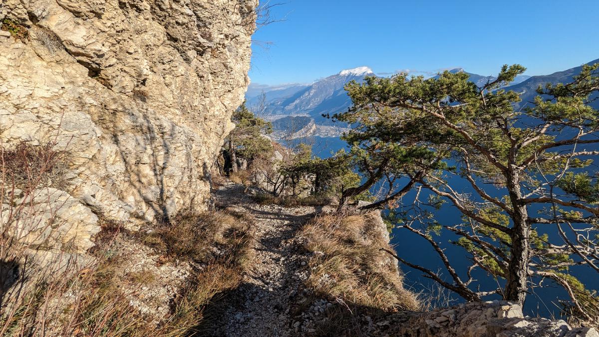 The hike to Punta Larici starts in the tranquil mountain village of Pregasina, which sits high above Lake Garda. From there, a well-maintained, steadily ascending path leads through shady forest sections and Mediterranean vegetation. We took the more exposed path along the ridge instead. Shortly before the end of the forest road you come to Punta Larici: a rocky outcrop that offers one of the most spectacular panoramic views of the region: deep blue water glittering vertically below you, and an unobstructed view of Limone sul Garda and the Monte Baldo massif opposite.